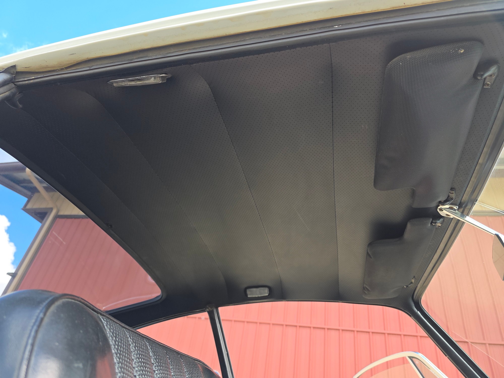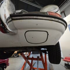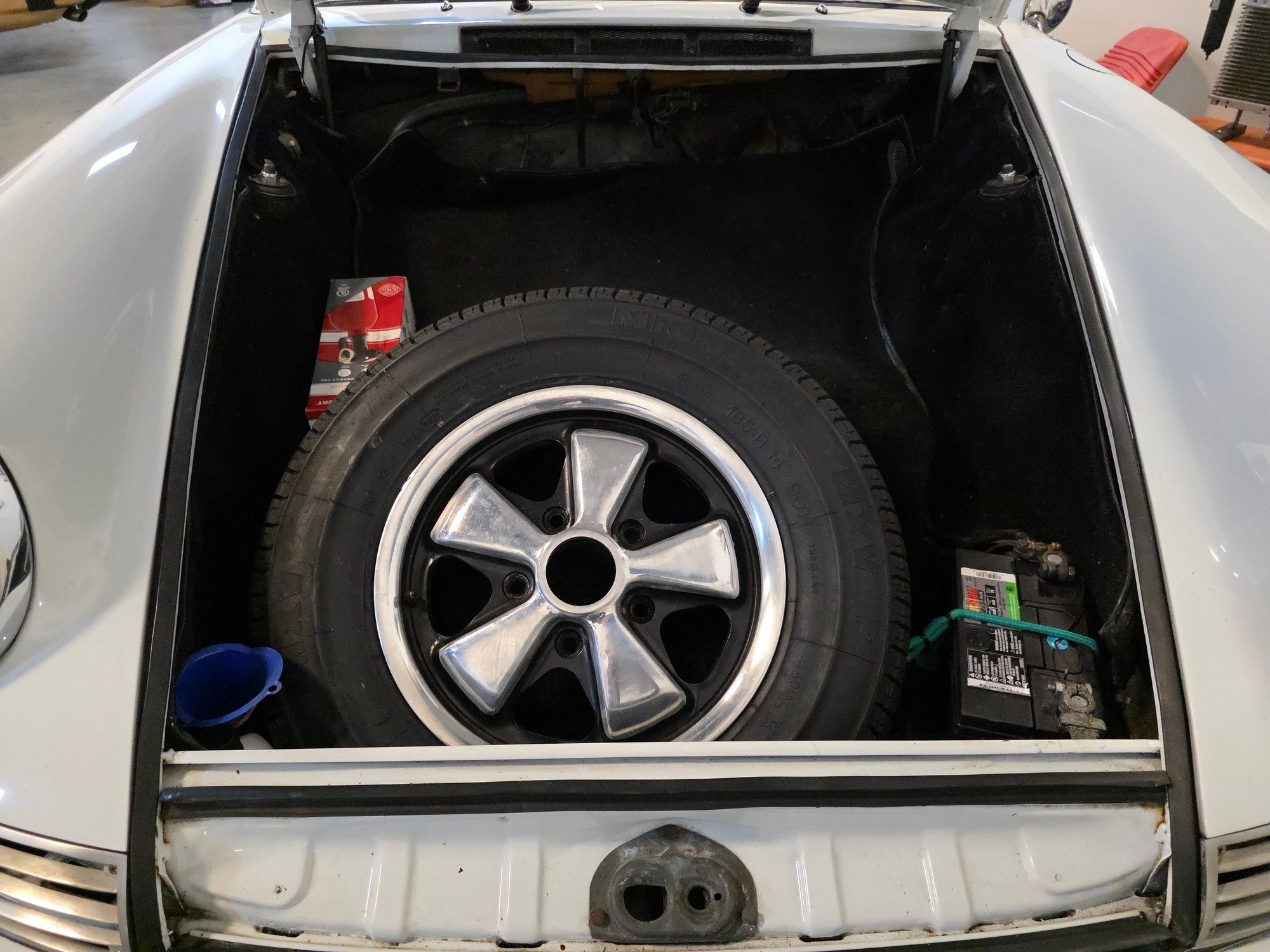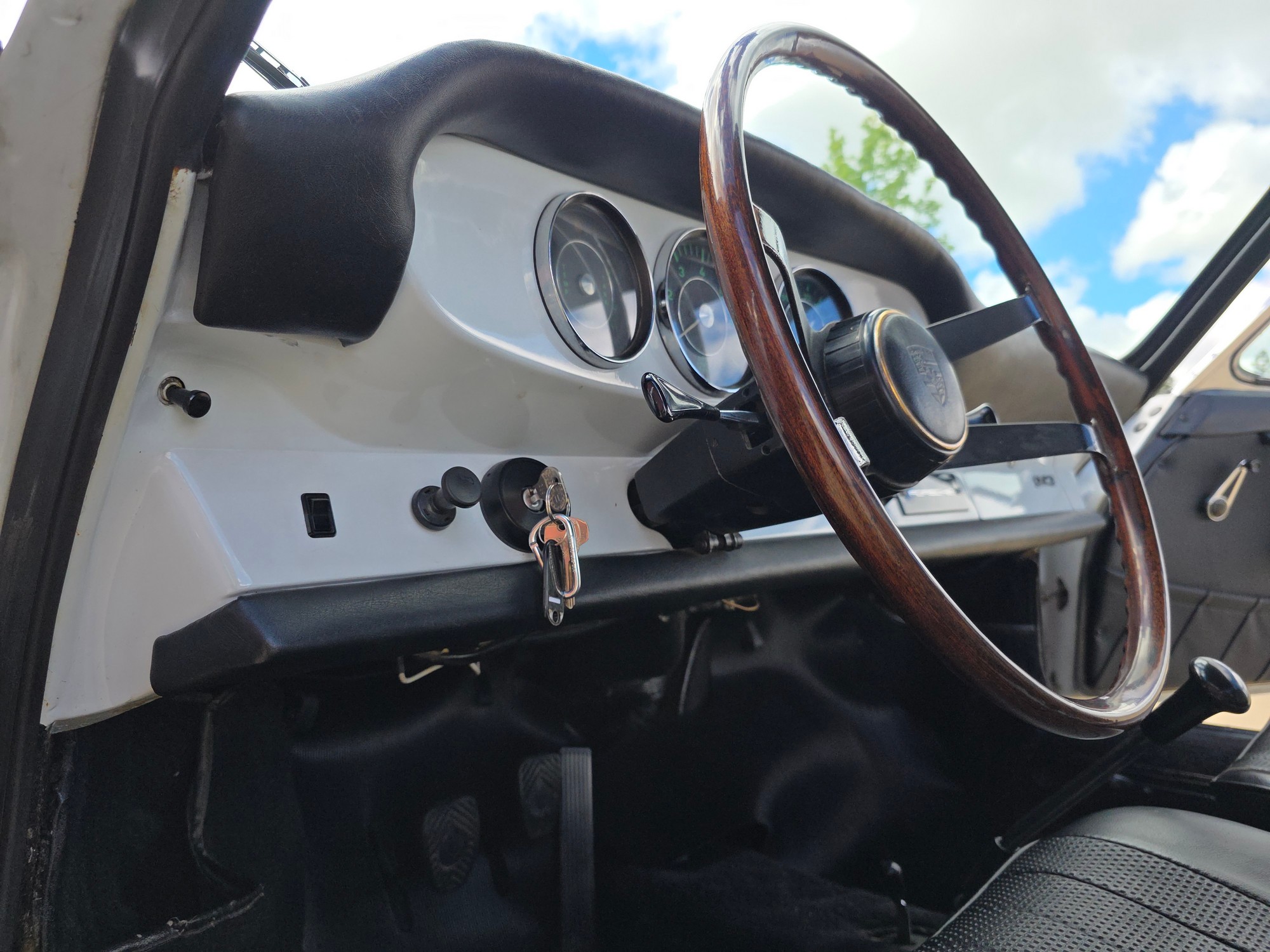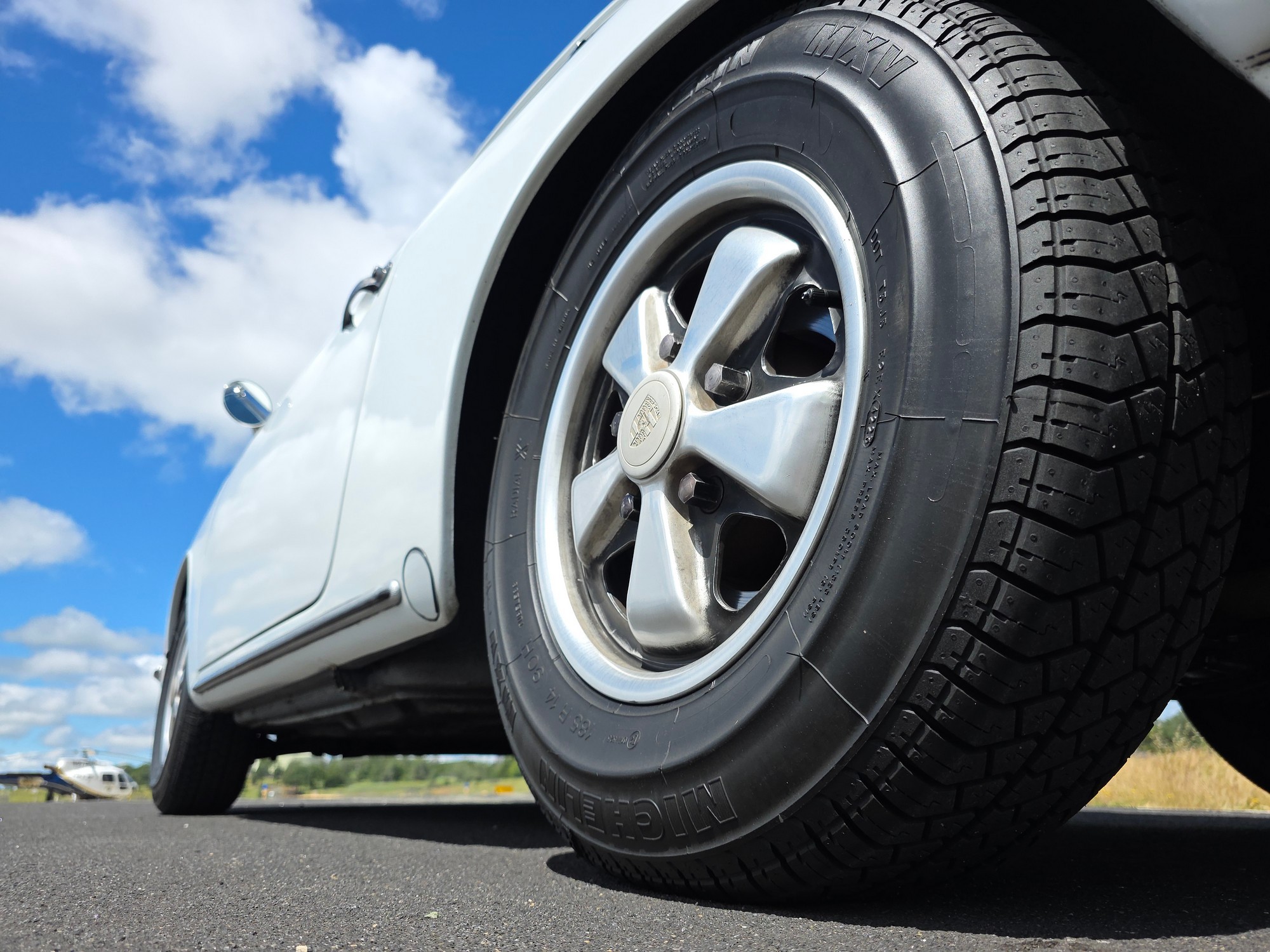 Body & Exterior: Straight body with an older repaint in the original Light Ivory. It presents beautifully, with excellent gaps and shutlines. The brightwork shows authentic patina, adding character without detracting from its vintage appeal. All glass is good, and it rides on authentic 14-inch Fuchs wheels (from 1976) fitted with brand-new Michelin MXV tires.