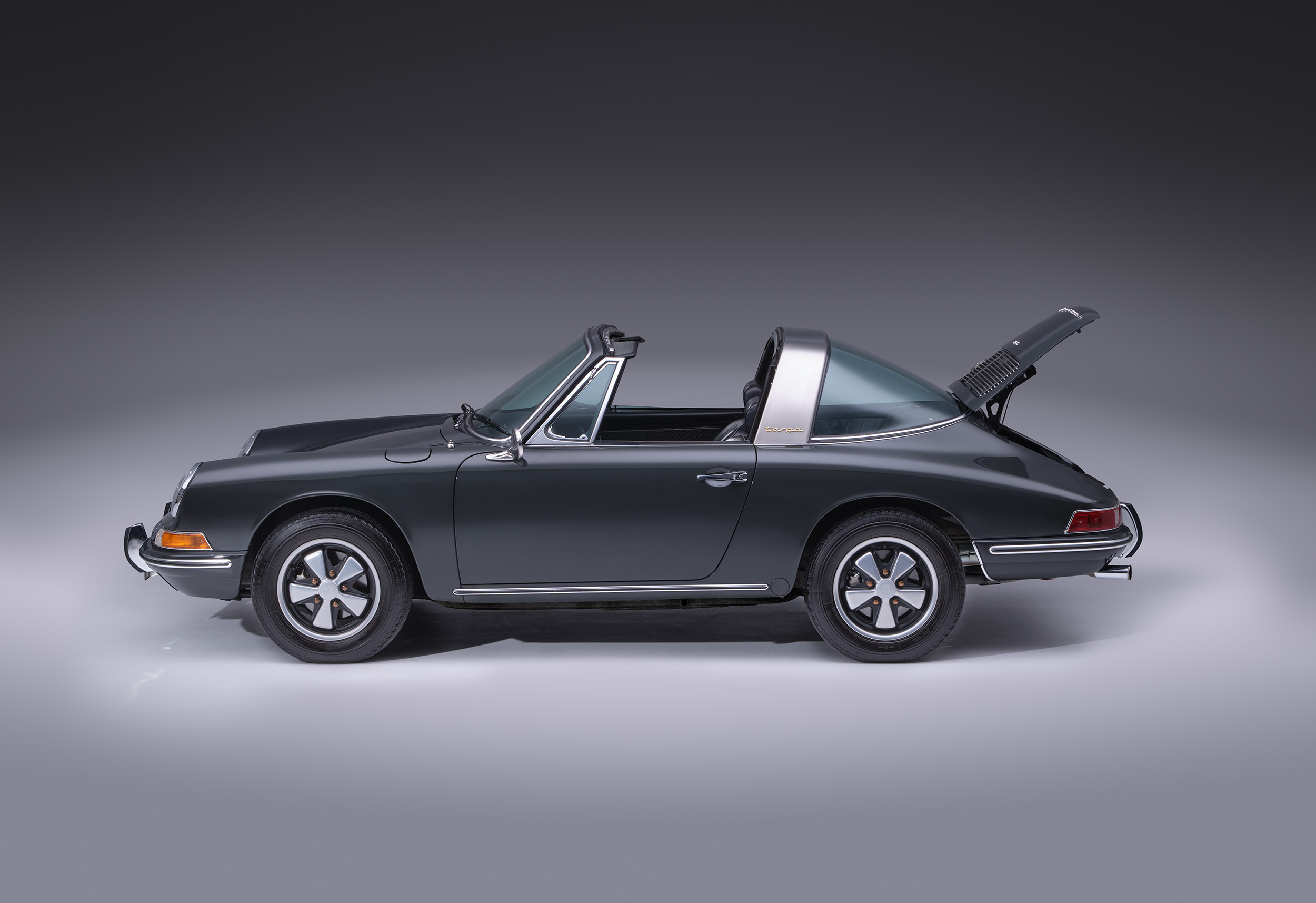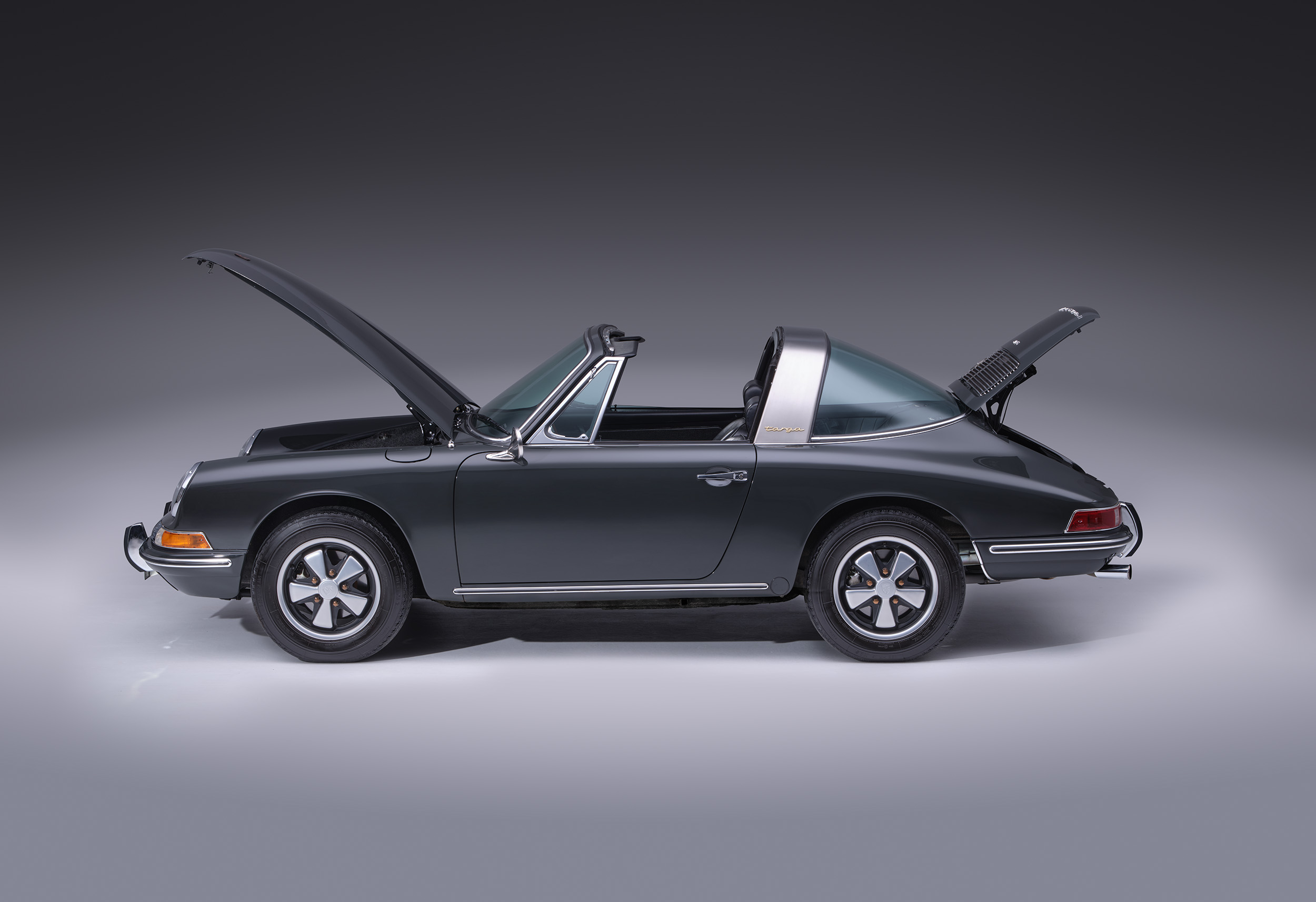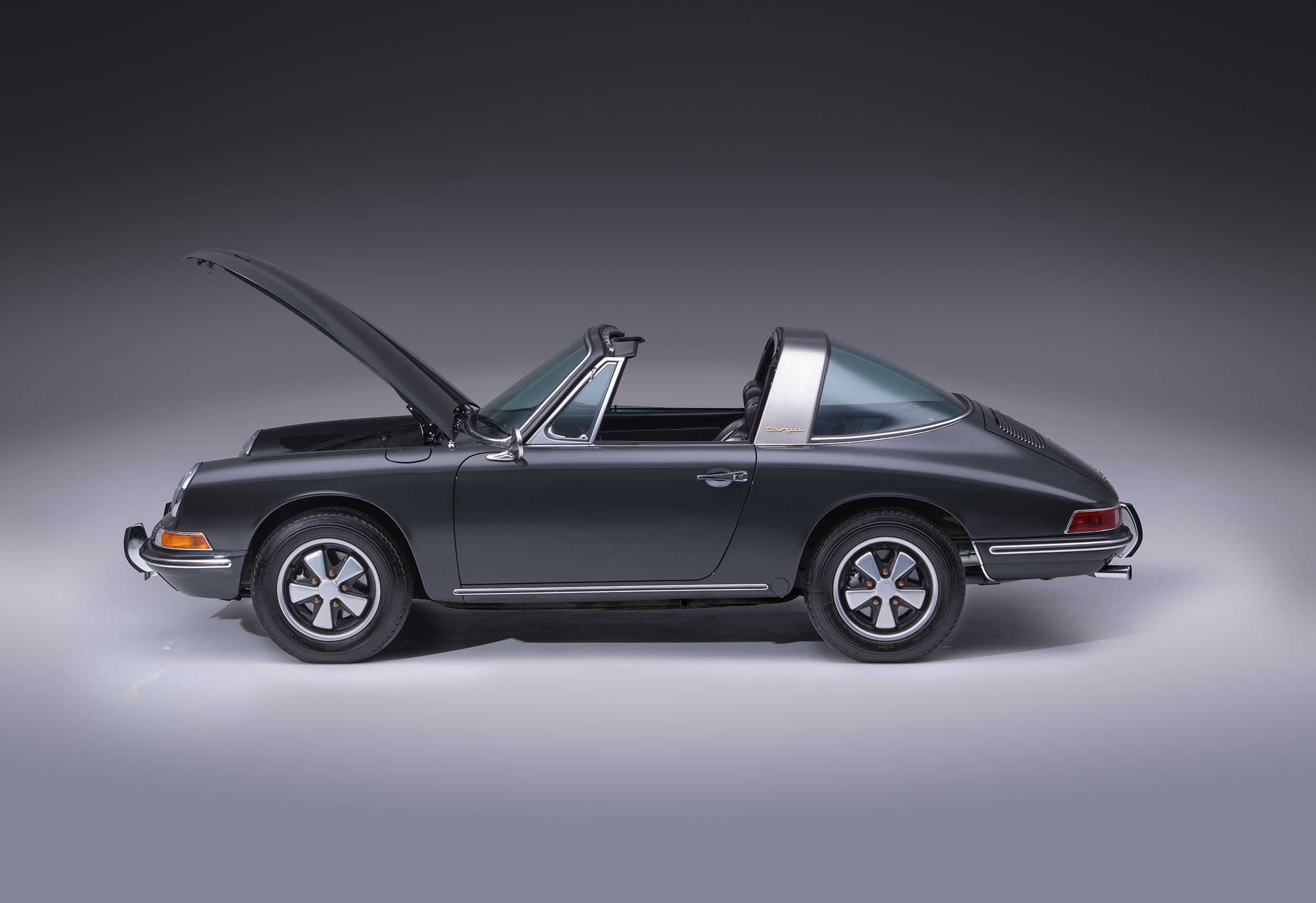 The car is flawless and better than new finished the sought after color of slate grey over black interior. Very few miles on the restoration of this numbers matching (exterior color has been changed) example. Date coded Fuchs wheels as well!
