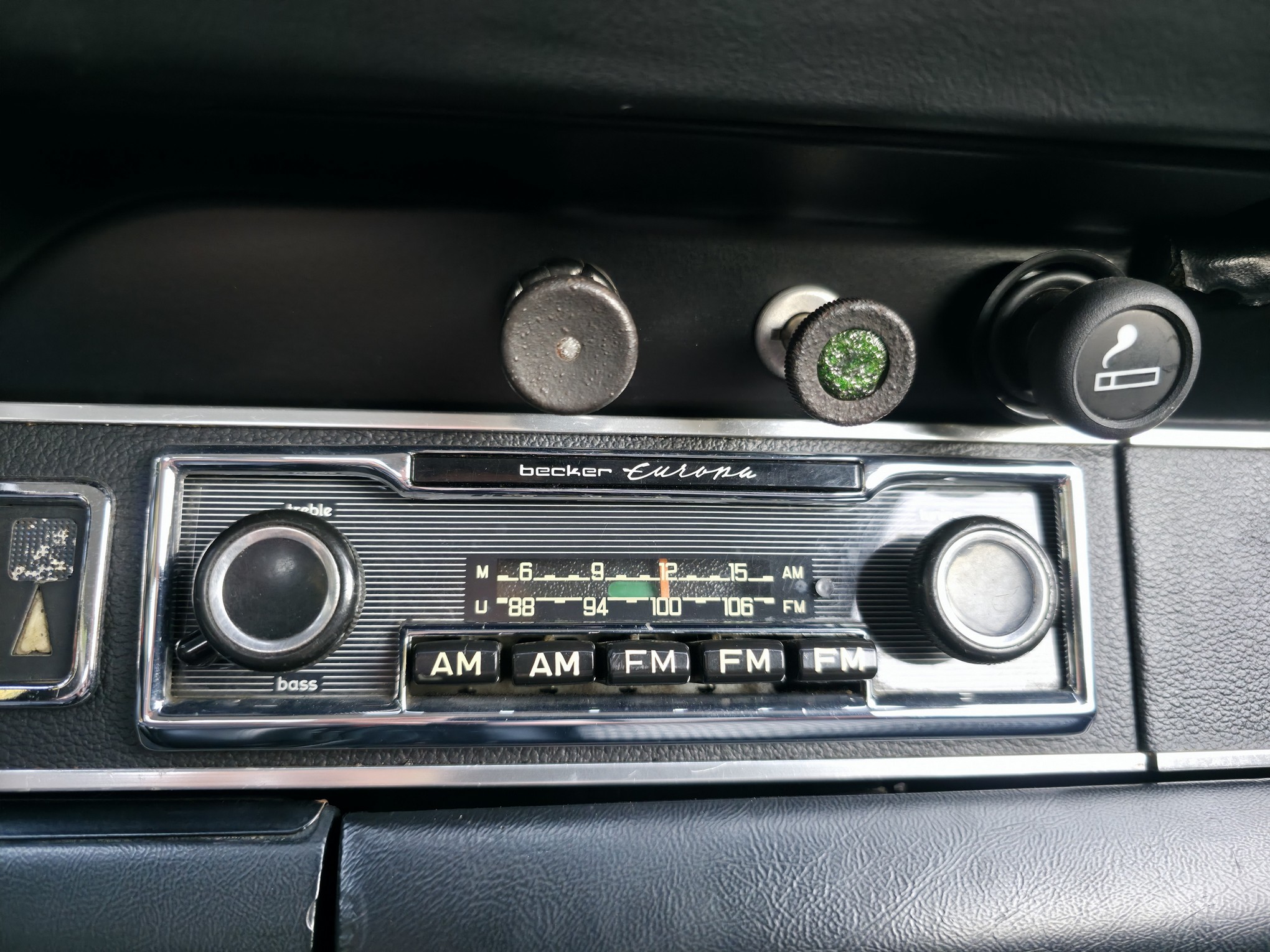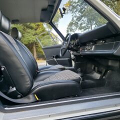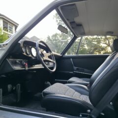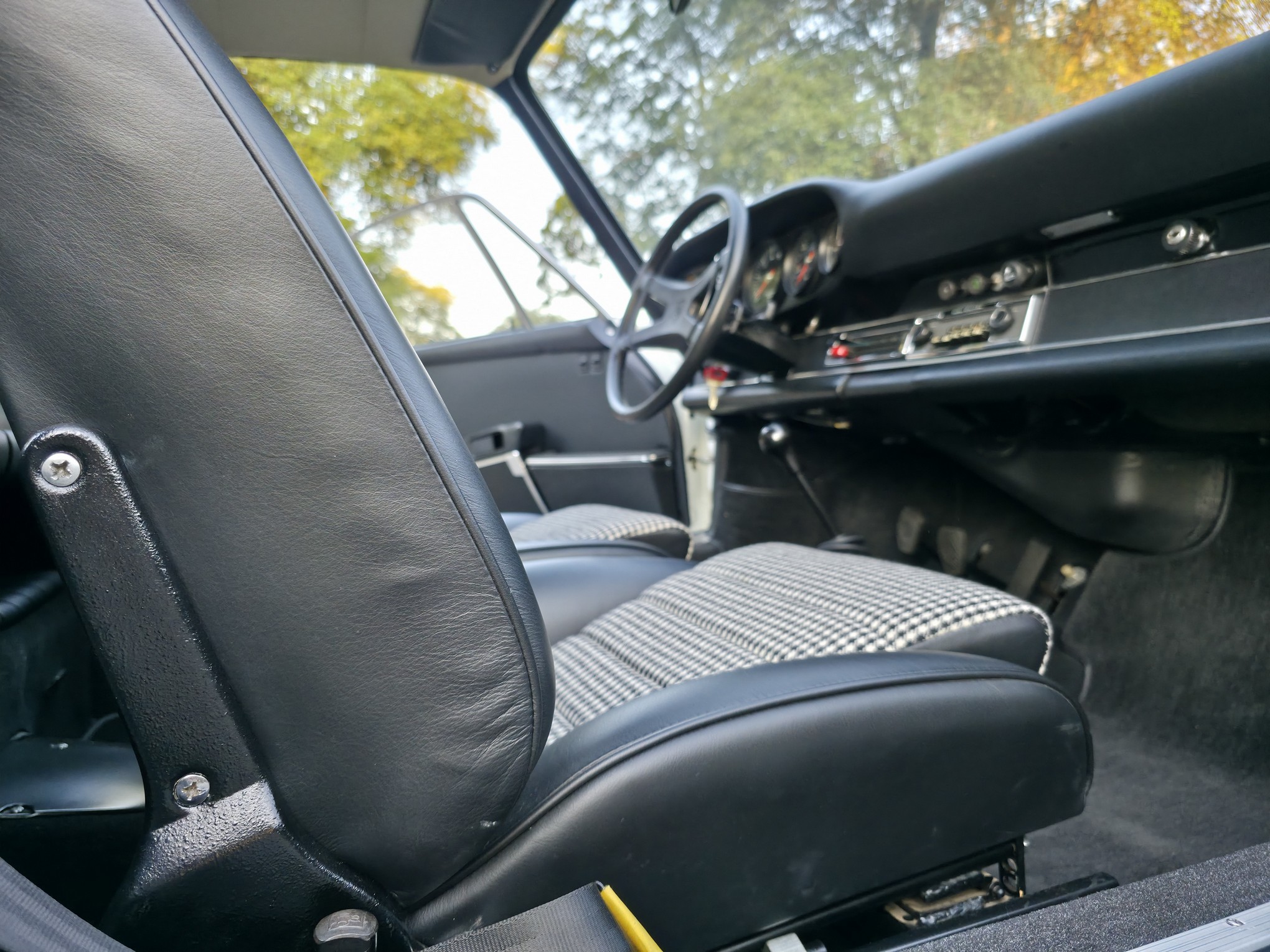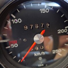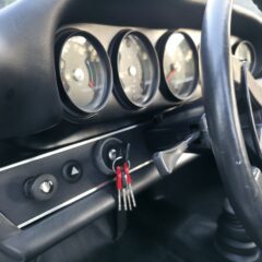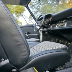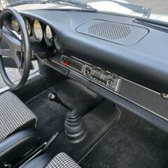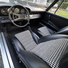 Der Wagen hat noch originales Sekurit Duennglas, nur die Windschutzscheibe ist Sigla. Im Innenraum sind neuwertige Teppiche, Dachimmel und Seitenpanaele verbaut. Die Instrumentierung (korrekter 250km/h Tacho für erste Serie) ist makellos, selbst die Uhr arbeitet noch. Der Kilometerzähler zeigt 97815km und wir gehen davon aus, dass dies die originale Laufleistung des Fahrzeugs (nicht des Motors) ist. Originales 380mm Carrera Lenkrad mit leicher Patina. Interessant, der Wagen wurde werksseitig mit elektrischen Fensterhebern ausgeruestet.